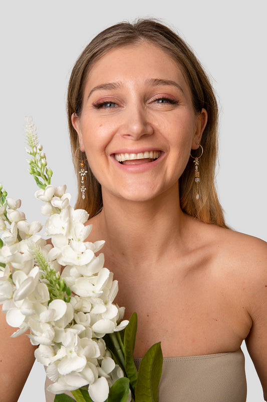 Steker oorbellen met fijne zoetwaterparels gedrapeerde met kettingen